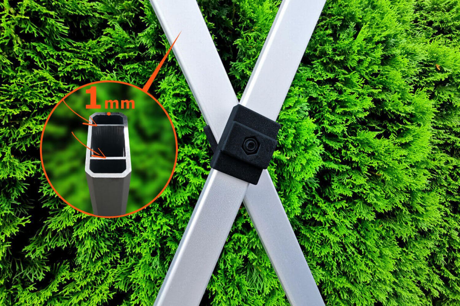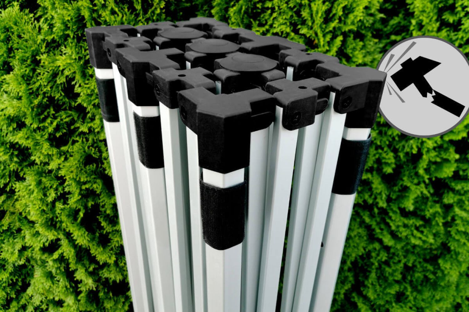 Rýchlorozkladací mechanizmus vám umožní vytvoriť veľkorysý krytý priestor pre váš tovar a zákazníkov za menej ako minútu, a to úplne bez náradia. Základom stability tohto mobilného stanu je robustný hliníkový profil s hexagonálnym (šesťhranným) prierezom. Hrube pätky na spodku nôh zabezpečujú spoľahlivé ukotvenie v teréne, zatiaľ čo kvalitné skrutkované spoje zaručujú hladkú manipuláciu a uľahčujú prípadný servis dielov.