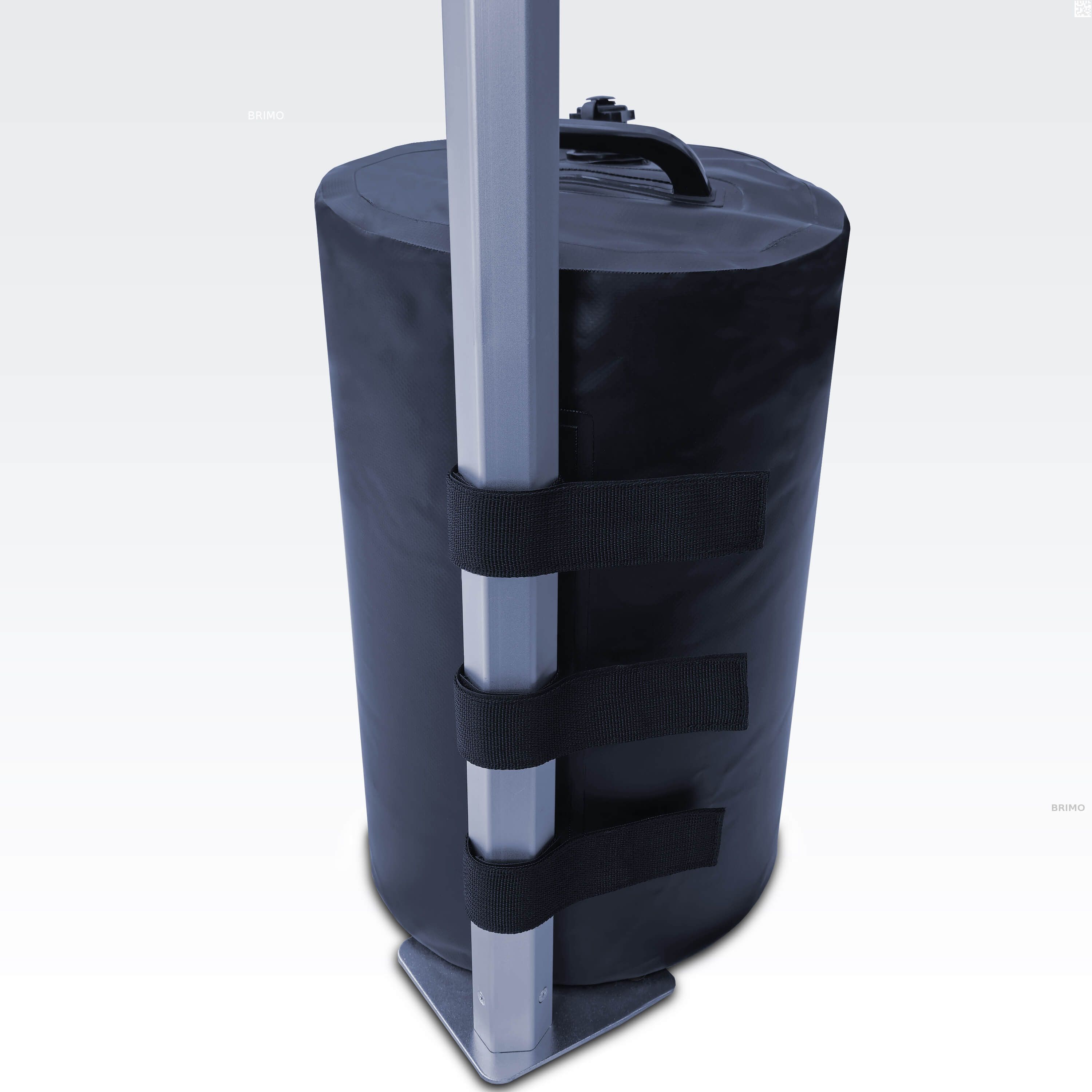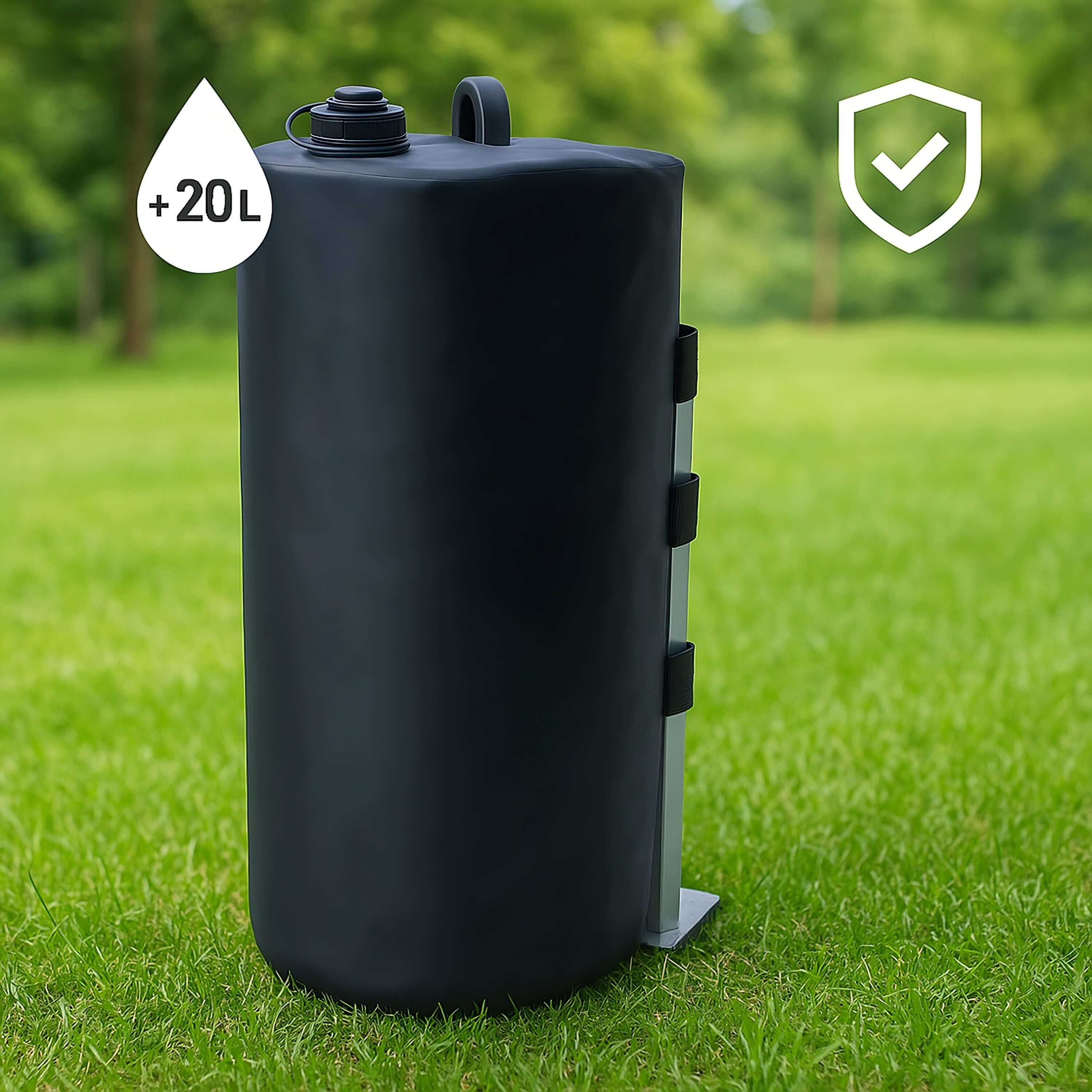 Objem 20 litrov – Po naplnení vodou dosahuje záťaž hmotnosť 20 kg, čo poskytuje dostatočnú stabilitu aj pri silnejšom vetre.